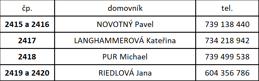 Členové výboru: svjditalska2415-20@seznam.cz Josef Bolina 733 329 751 Předseda SVJD Heda Linhartová 604 409 351 Místopředseda SVJD Petra Novotná 608 158 918 Člen výboru SVJD Zdeněk Kolařík 773 010 002 Administrátor webu Předchozí Další Důležité kontakty: Email výboru svjditalska2415-20@seznam.cz Radek Šefčík - elektro, zvonky 602 104 977 Lukáš Hejda - Opravy voda, topení 607 638 750 Marcela Krausová - SBF (Správa nemovitosti) 312 246 302 Domovníci